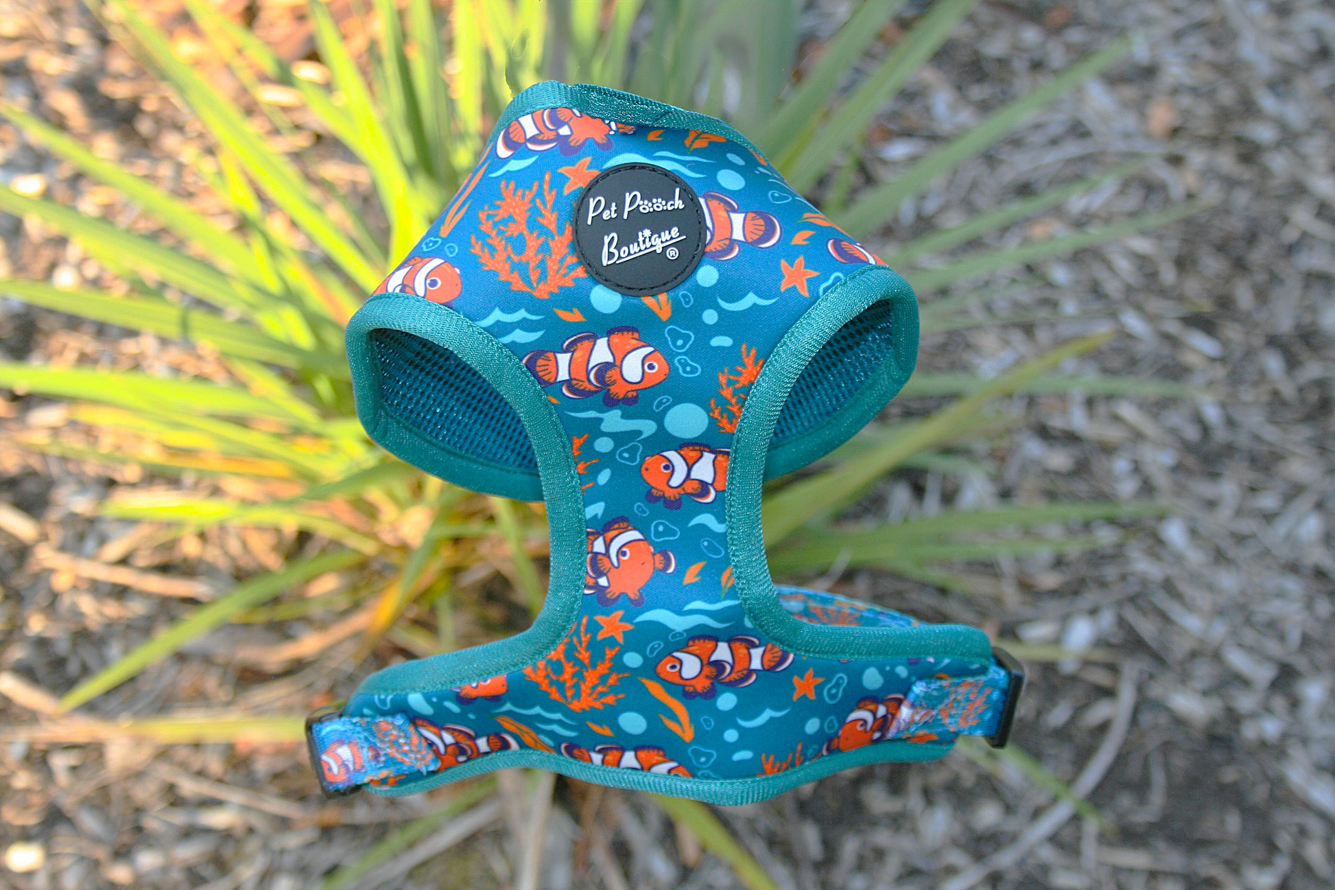 Make a splash in style. The Under the Sea Harness brings a wave of coastal charm to your pup’s wardrobe — a dreamy sea-blue design sprinkled with cheerful Nemo-inspired fish. Soft, secure, and impossibly cute, it’s made for pups who turn heads on every walk (and for the humans who adore them).